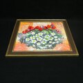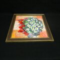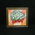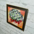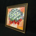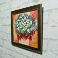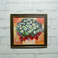 「苺の花」は、生命力に満ちた苺の様子を鮮やかで大胆な筆致で描き出した特別な油絵です。背景には、春の訪れを感じさせる暖色系(黄色、赤、オレンジ)の複雑なテクスチャが広がり、画面全体にエネルギッシュな印象を与えています。白い苺の花々が、賑やかな背景に対して純粋で可憐な雰囲気を醸し出し、特に花の中心部分の黄色が見る人の視線を引きつけます。