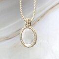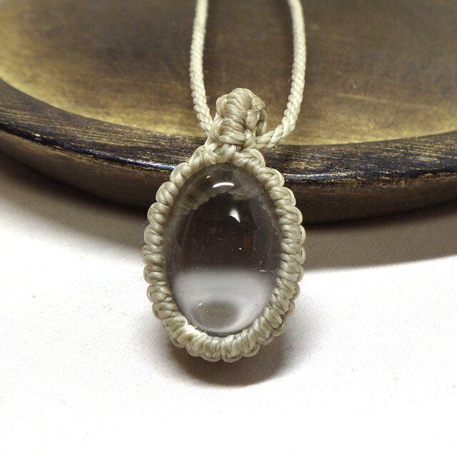 ぷるんとした透明感が魅力の水晶を、落ち着いたベージュのコードでシンプルに編み上げました。