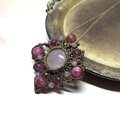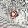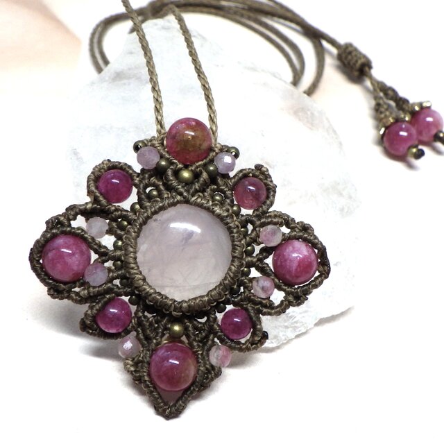 中心には優しいピンク色のローズクォーツをフレーミング、その周囲には2色のピンクトルマリンとメタルビーズを編み込んだデザイン。