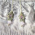 〈使用材料〉ブラジル「Linhasita社」製のワックスコード、天然石(アメジスト、水晶、フローライト、ラベンダーアメジスト)メタルビーズ等。
