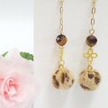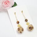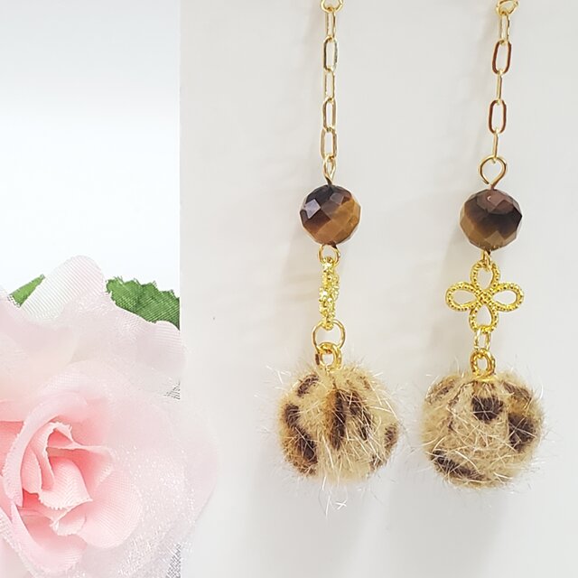 アニマル柄のふわふわファーにカットの入ったタイガーアイを合わせた大人可愛いチェーンピアスです。