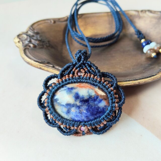 青の濃淡、白、赤茶の模様が美しく混ざり合い、まるで地球そのものを切り取ったようなソーダライトのネックレスです。