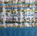 白地にブルー、グリーン、グレー、銀糸等の糸を織り込んであります。