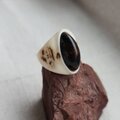 鹿角の柔らかな白と、紅十勝石の黒〜赤のコントラストは、金属リングでは出しづらい独特の雰囲気を生みます。