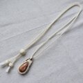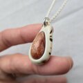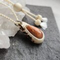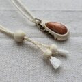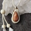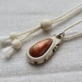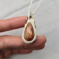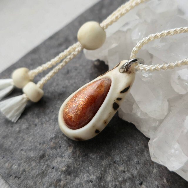 鹿の角を削り出して成形した土台に、サンストーンを埋め込んだペンダントです。