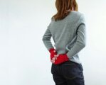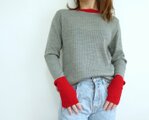 【日本製】フィンガーホール付きウールブレンド配色ニット <グレー×レッド>