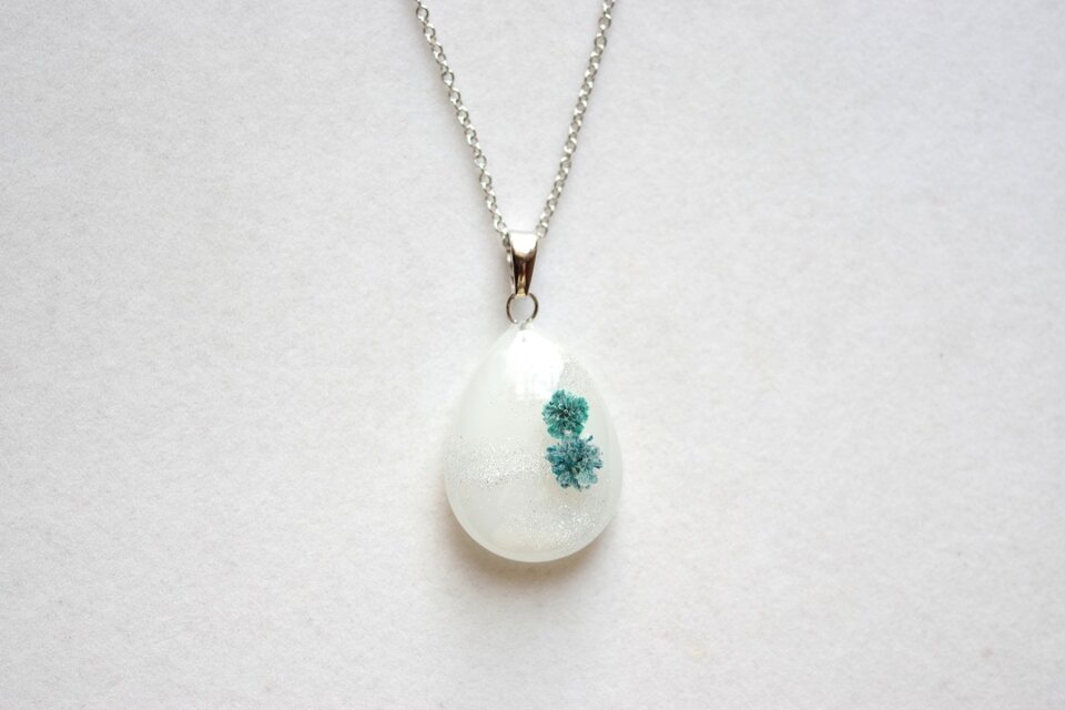 ドロップ型のレジンにお花を二輪咲かせた可憐なペンダントです。