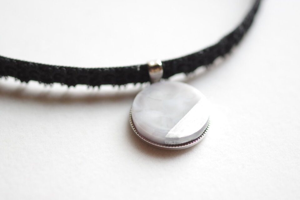 グレーとホワイトが美しいマーブル模様を描くレジンにシルバーの装飾を施し、ベルベットリボンにタティングレースで装飾を施したチョーカーに仕上げました。