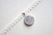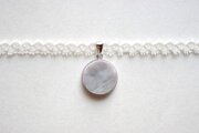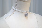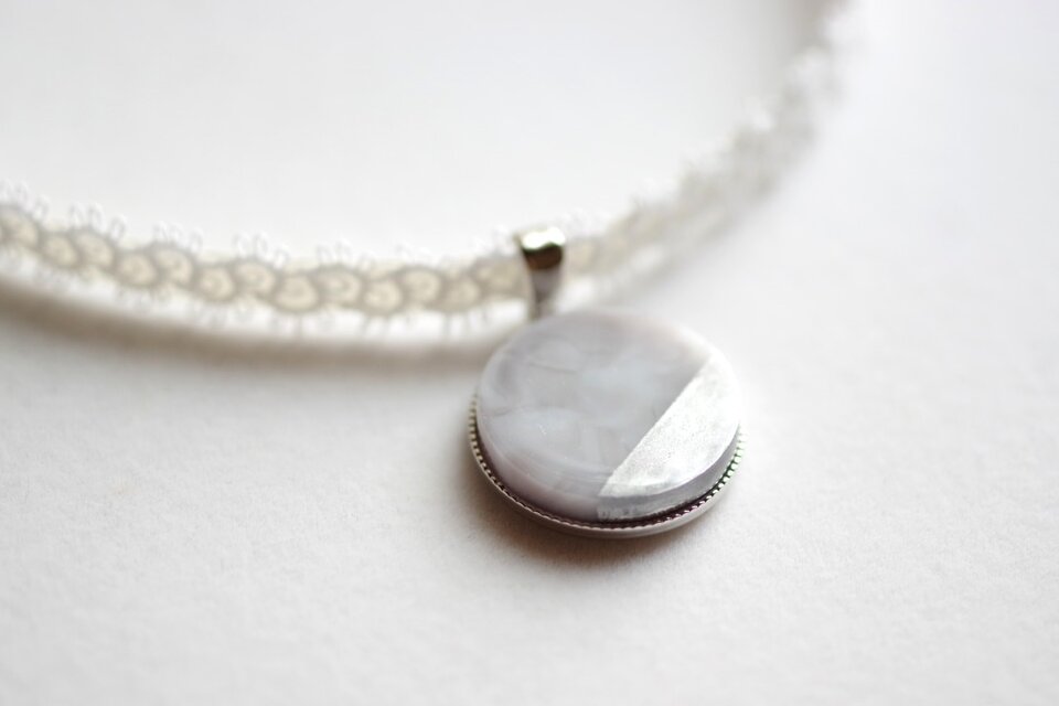 グレーとホワイトが美しいマーブル模様を描くレジンにシルバーの装飾を施し、サテンリボンにタティングレースで装飾を施したチョーカーに仕上げました。