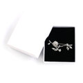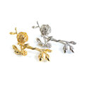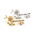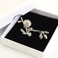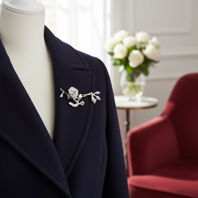 繊細に咲くローズと枝葉のラインを立体的に表現した、上品なローズモチーフブローチ。しなやかに伸びるブランチデザインが、胸元やストールに自然な動きを添え、コーディネートをさりげなく格上げしてくれます。ジャケットやニット、ワンピースはもちろん、帽子やバッグのアクセントとしてもおすすめです。派手すぎず上品な存在感で、日常使いからセレモニー、ギフトまで幅広く活躍するフラワーブローチ。植物モチーフがお好きな方や、大人の装いにさりげない華を添えたい方におすすめの一点です。専用のボックスに入れてお届けいたします。