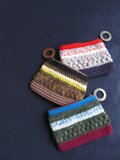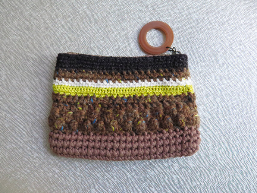 色々な色を組み合わせたファスナー付きの手編みのポーチです。