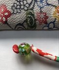 中綿を入れ、正絹の着物で作ったループを付け、ループの先にトンボ玉と山サンゴを付けています。