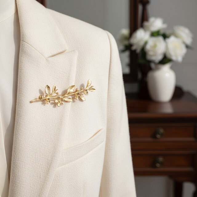 繊細な枝に小花と葉をあしらった、真鍮製のブローチです。アンティーク調のゴールドカラーが上品で、日常の装いから特別なシーンまで幅広く活躍します。植物モチーフならではの自然な立体感と華やかさが魅力で、ジャケットやワンピース、ストールなどに合わせるだけで、コーディネートを格上げしてくれるアクセサリーです。専用ボックス入りで、贈り物にも最適です。