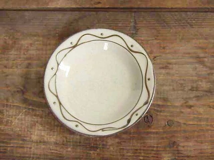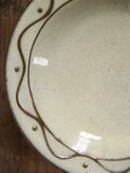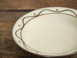 素地に化粧泥を掛けてからイッチンで模様を描き透明釉を施釉したお皿です。