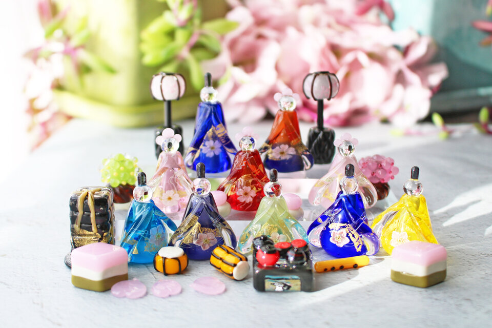 雪洞や菱餅、桜橘なども全てガラスでひとつひとつ丁寧に制作いたしました。