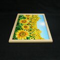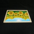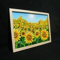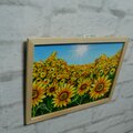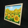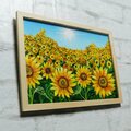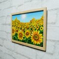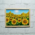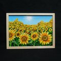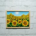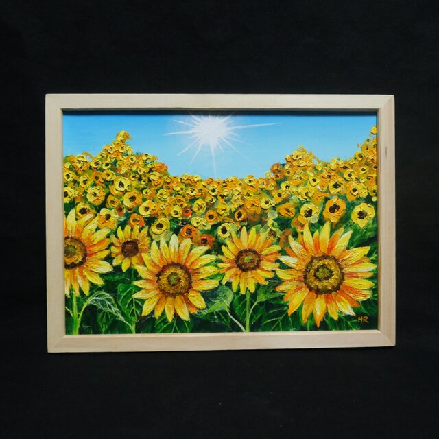 「太陽とひまわり畑」は、生命力溢れるデザインと色彩豊かなひまわり畑を描いた特別な油絵です。縦21.0cm、横29.7cmのサイズは、お部屋に彩りと明るさを与え、見る人に元気をもたらします。ひまわりは「元気」や「明るさ」の象徴とされ、その姿勢は大切な目標に向かって進む力強さや、光と純粋さを表現しています。