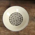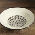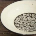 お皿の表面に印花を押し化粧泥を掛けてから長石釉を掛けて焼成しています。