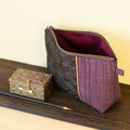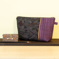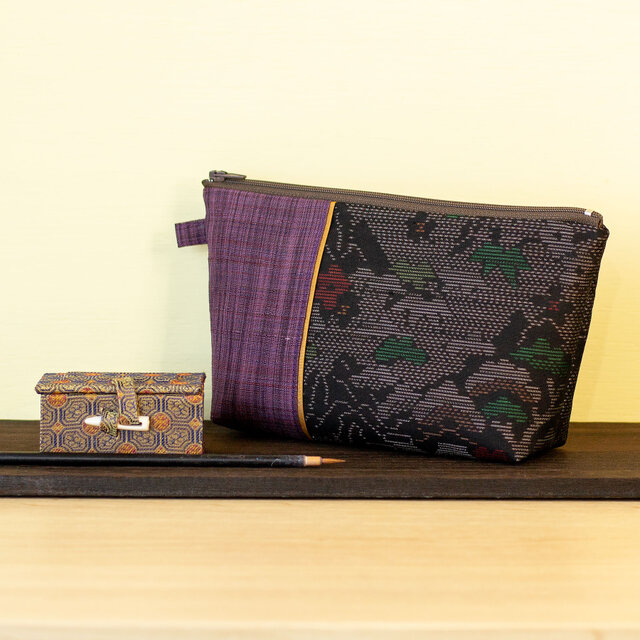 大島や他正絹紬・絣などを切り替えてオシャレに細いラインで締めました手作りポーチです。柄物の生地は表側で良い柄が出るようにしておりますので反対面は成り行きです。内袋は和柄の木綿地や胴裏・八掛などを使っています。細いラインは白大島を手染めでムラ染めにしたものをバイアステープに仕立てております。金茶ライン・赤ラインは正絹八掛をバイアスにしております。