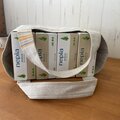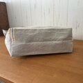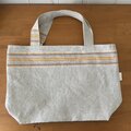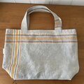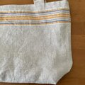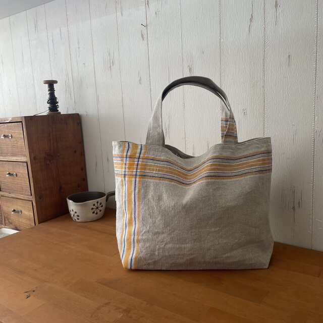 1920年代のドイツのアンティークリネンマングルクロス幅広の黄色×白×青のクロスラインでトートバッグを作りました。片側にだけクロスラインを使用しています。貴重な幅広の黄色のクロスラインです。