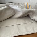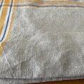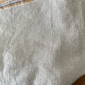 今回のアンティークリネンマングルクロスの生地は中厚の普通な感じです。ネップ(繊維のかたまり)や繊維の縫い込みや飛び出しなど多く見受けられます。目立ったシミや汚れなどはありませんが、見落とししまってるかもしれません。茶色っぽい繊維がポツポツと縫い込まれています。全体的に毛羽立ちもございます。