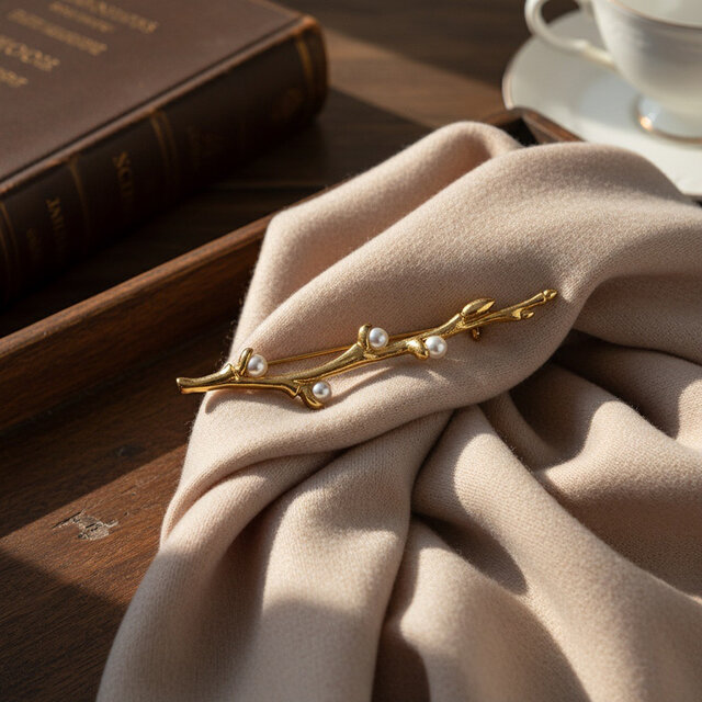 枝をモチーフにした繊細なラインに、小粒のパールをあしらった上品なブローチ。自然の枝のような有機的なフォルムが、ジャケットやコート、ワンピースにさりげない華やかさを添えます。ゴールドカラーの艶やかな質感とパールの柔らかな輝きが調和し、フォーマルからきれいめカジュアルまで幅広いスタイルに対応。入学式・卒業式などのセレモニーシーンはもちろん、普段使いのアクセントとしても活躍します。ストール留めやバッグチャームとしても使いやすく、ギフトにもおすすめのデザインブローチです。