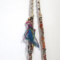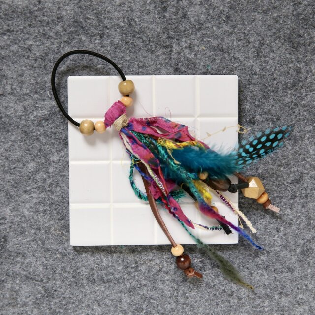 フェザー(羽飾り)やウッドビーズ・裂き布・シルク糸・ニット糸・革紐などを付けたハンドメイドのゴム飾りです。