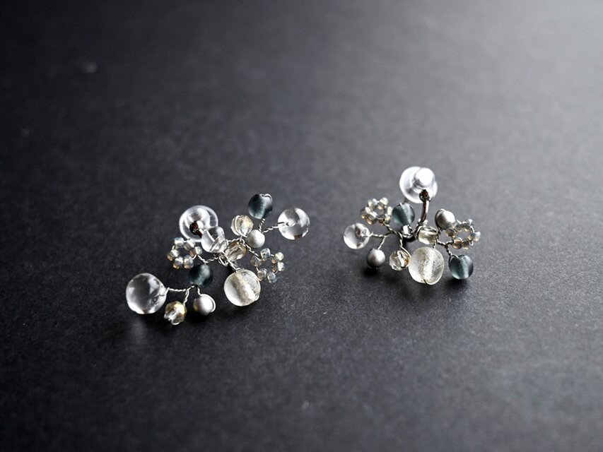 透明なしゃぼん玉ビーズとすりガラスのような真ん丸ビーズが魅力のボタニカルシャボン玉イヤリングです。