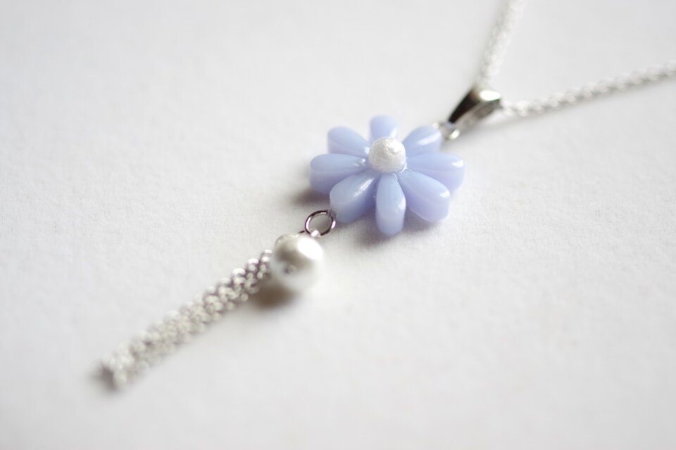 中心の花芯とコットンパールの光沢のある輝きが上品なペンダント。