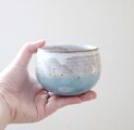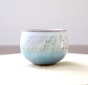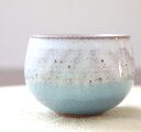 ころんと丸いお湯のみの形に成形後、艶やかな白い釉薬と落ち着いたニュアンスブルーの釉薬をかけて焼き上げました。