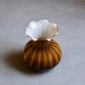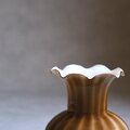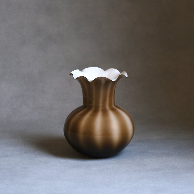 ふっくらと丸みを帯びたボディからすっと立ち上がるネック、そして花びらのように波打つフリル状のリムが印象的なガラス製フラワーベース。ずっしりと安定感があるのでシェルフやサイドボードにオブジェとして飾ってもインテリアに映える1点です。