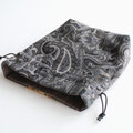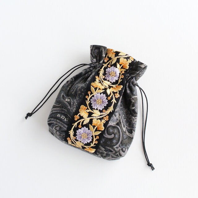 インド刺繍リボンのマチのある巾着ポーチ  ビエラペイズリーグレー