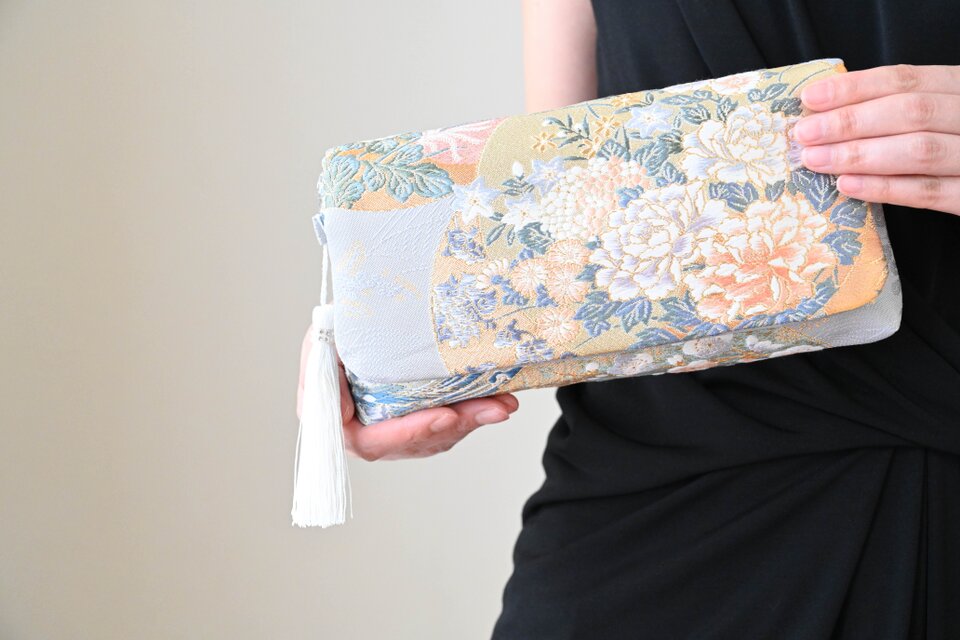 花丸文・華紋織出しのシルク帯で製作した2Wayクラッチ&ハンドバッグです。
