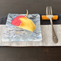 カットして出る小さなかけらを板ガラスに並べて焼成します。