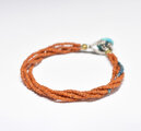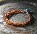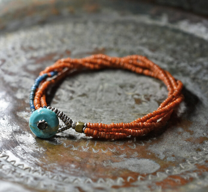 アンティークオレンジ色シードビーズとエメラルドブルーのビーズを4連にしたブレスです。