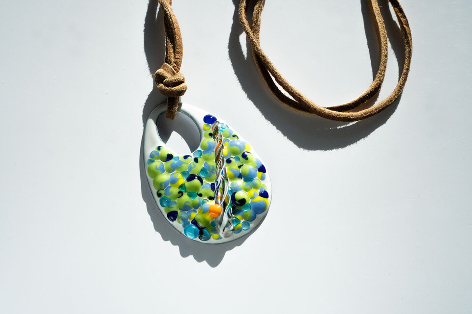 白い土台の上にバーナーで作ったオリジナルガラスを乗せて焼成しました。