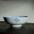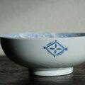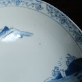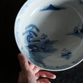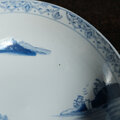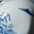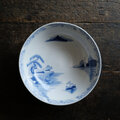 素朴な風景図◆縁はオリエンタルな文様。瀬戸焼 時代染付印判大鉢 碗 骨董・antiques 古民家 大正〜昭和初期