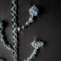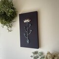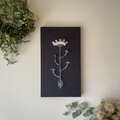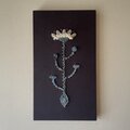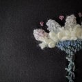 墨色のコットンリネン地に羊毛から手紡ぎした糸で刺繍し、温かみのある少しユーモラスなお花のファブリックパネルに仕上げました。