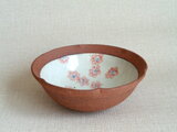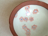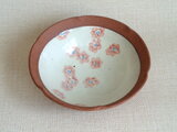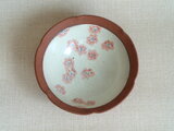 この器は、信楽の土を使いろくろで作った鉢に紅梅を丁寧に手描きし焼成を重ねて仕上げています。鉢の縁は花びらのような輪花形で、紅梅の絵付けと調和し器に可憐な表情を添えています。底に直筆で銘を入れています。
