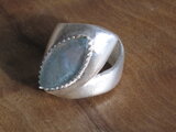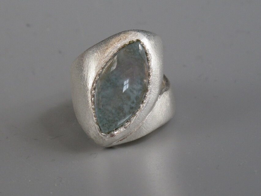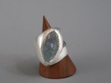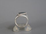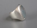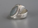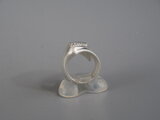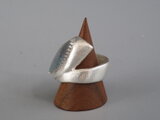リングのサイズは13号、重さは17g、最大幅は24mm、手のひら側の幅は8mm、金属部分は純銀です。