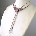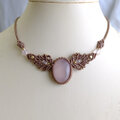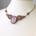 透明感があり、艶やかでほんのり桜色の色合いが美しいブラジル産ローズクォーツのマクラメ編みチョーカーネックレスです。みずみずしく内部のストライプ模様が魅力的なローズクォーツとマダガスカルローズ丸玉を組み合わせ丁寧に編み込み首元で上品に彩る印象的なマクラメアクセサリーに仕上げました。