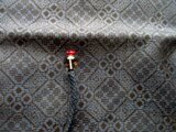 中綿を入れ、正絹の藍大島紬の着物で作ったループを付け、ループの先に水晶の玉と山サンゴを付けています。