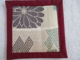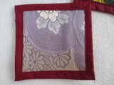 このコースターの裏生地は着物の裏地に使われるエンジ色の和布を使っています。
