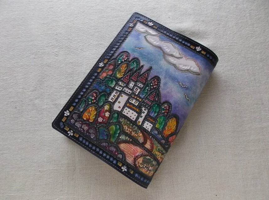 単行本サイズブックカバー(ソフトカバー、ビジネス書) 牛革 刻印&拭き染め
