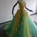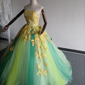 実例写真!カラードレス グリーン グラデーション ベアトップ 繊細レース チュールスカート 前撮り 花嫁