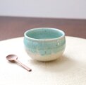 口元にトルコブルーの釉薬を重ね合わせ、流れるような模様を描くように焼き上げました。