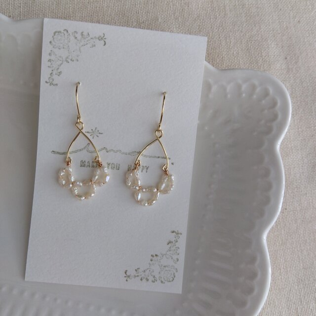 14kgf 小さな淡水ライスパールのレースピアス