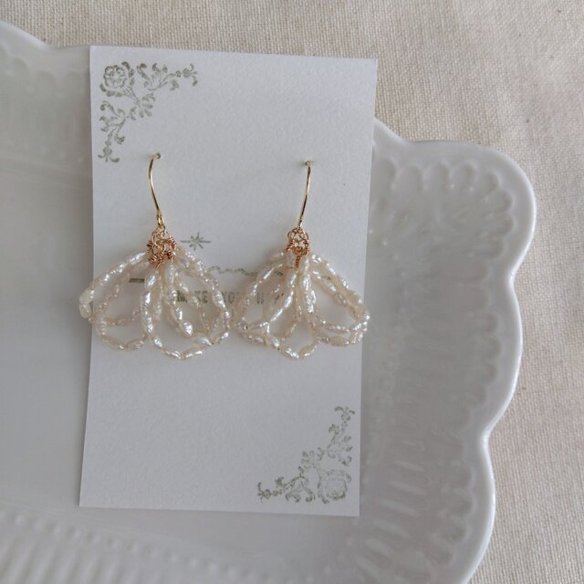 14kgf 小さな淡水ライスパールの華やかフラワーピアス