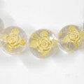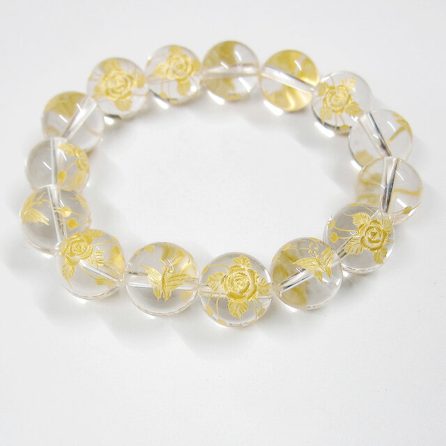 薔薇と蝶が彫られた本水晶のブレスレットです。透明感の綺麗な大粒の水晶に金色の薔薇と蝶が浮かびます。