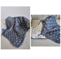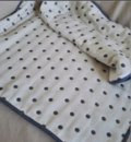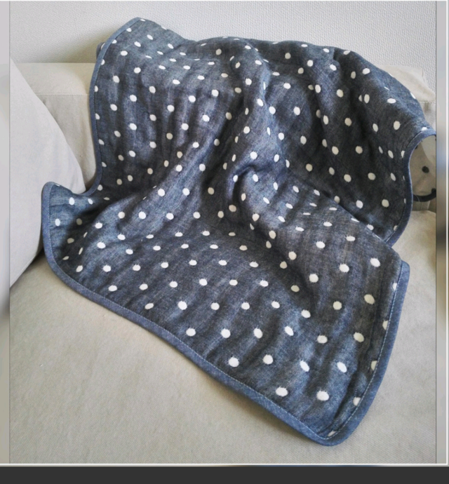 チャコールグレーに近いネイビー地ドットのふんわり6重ガーゼブランケットです。縁はネイビーダンガリーのバイアスで包みました。