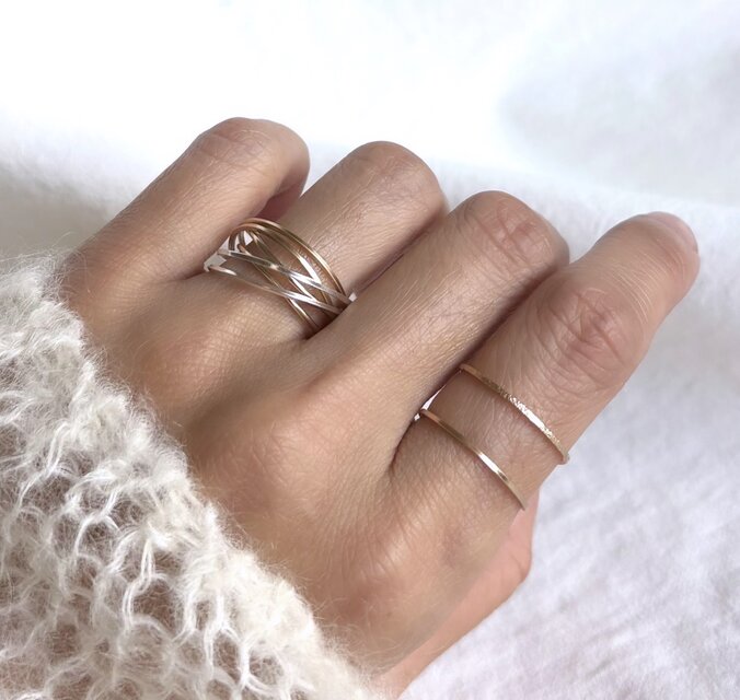ご好評いただいているゴールドシルバーミックスの3連のような6連のようなリングと、新作のテクスチャー感、繊細さが美しい2連リング。